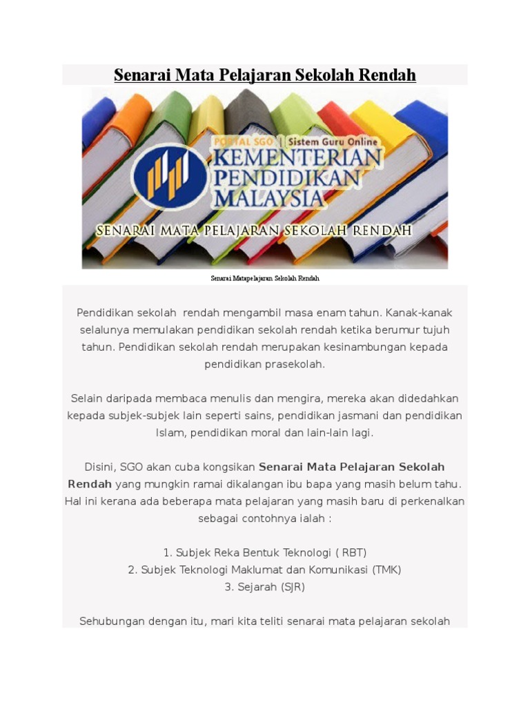 Senarai Mata Pelajaran Sekolah Rendah