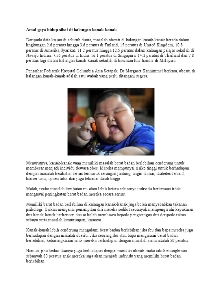 Bahagian pemakanan kementerian kesihatan malaysia kkm dalam satu kenyataan di facebooknya hari ini berkata peningkatan masalah obesiti dalam kalangan kanak kanak semakin membimbang. Osa boleh dikenal pasti melalui bunyi dengkur dan halangan separuh atau sepenuhnya yang berulang kali berlaku di bahagian atas salur udara seseorang. Mereka ini juga mempunyai berat badan sekurang kurangnya. Mereka yang tergolong dalam obesiti biasanya mempunyai berat badan sekurang kurangnya dua kali lebih berat berbanding ukuran ideal.