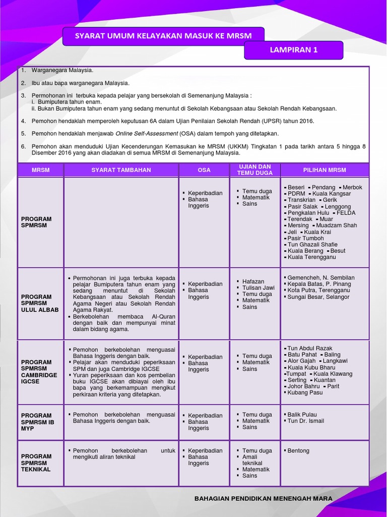 Syarat Umum Kelayakan Masuk Ke Mrsm Tingkatan 1 Semenanjung