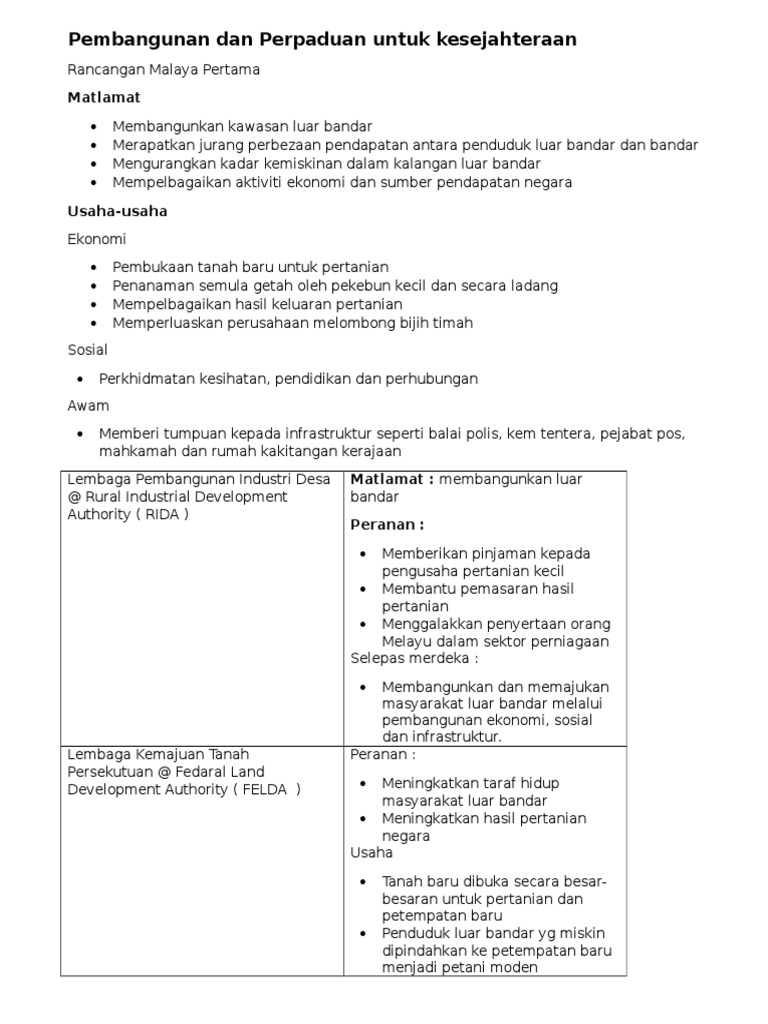 Pembangunan ekonomi senaraikan tahap pertama rancangan pembangunan lima tahun. Bab 8 pembangunan dan perpaduan untuk kesejahteraan. Pembangunan nasional mengandung makna peningkatan kesejahteraan material dan spiritual karena diarahkan untuk mencapai tujuan bangsa yaitu mewujudkan suatu masyarakat adil dan makmur yang merata materiil dan spiritual berdasarkan pancasila di dalam wadah negara kesatuan suasana peri kehidupan bangsa yang aman tenteram tertib dan dinamis. Untuk makluman pelajar dikongsikan nota sejarah tingkatan 5 bab 8 pembangunan kesejahteraan yang berkaitan tentang pembangunan dan perpaduan untuk kesejahteraan yang boleh dijadikan sebagai panduan dan rujukan pelajar ketika mengulangkaji sebelum peperiksaan spm.