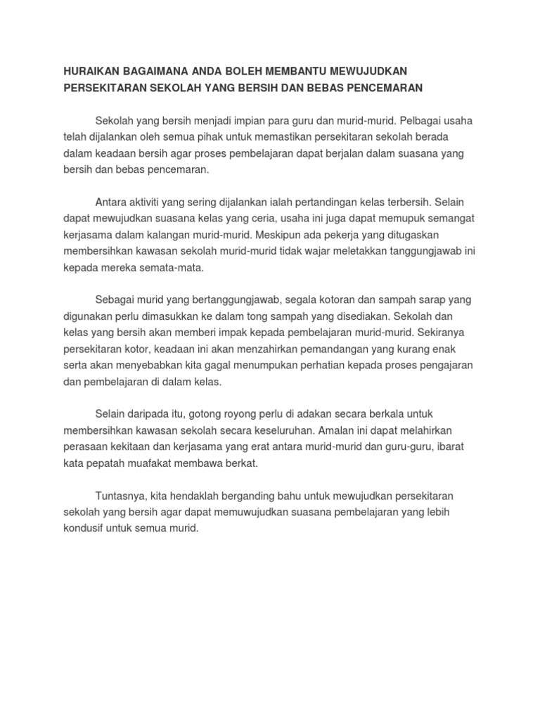 Huraikan Bagaimana Anda Boleh Membantu Mewujudkan Persekitaran Sekolah Yang Bersih Dan Bebas Pencemaran
