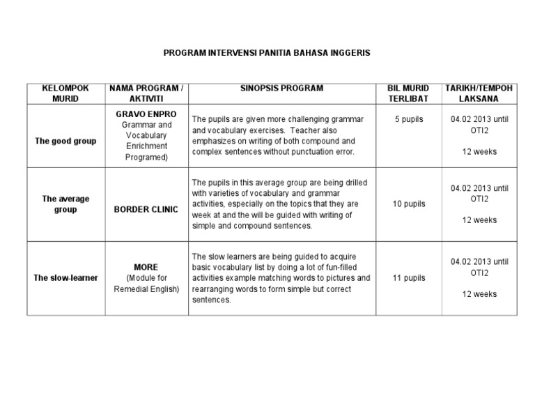 Program Intervensi Bahasa Inggeris Tahun 1 Pdf Document